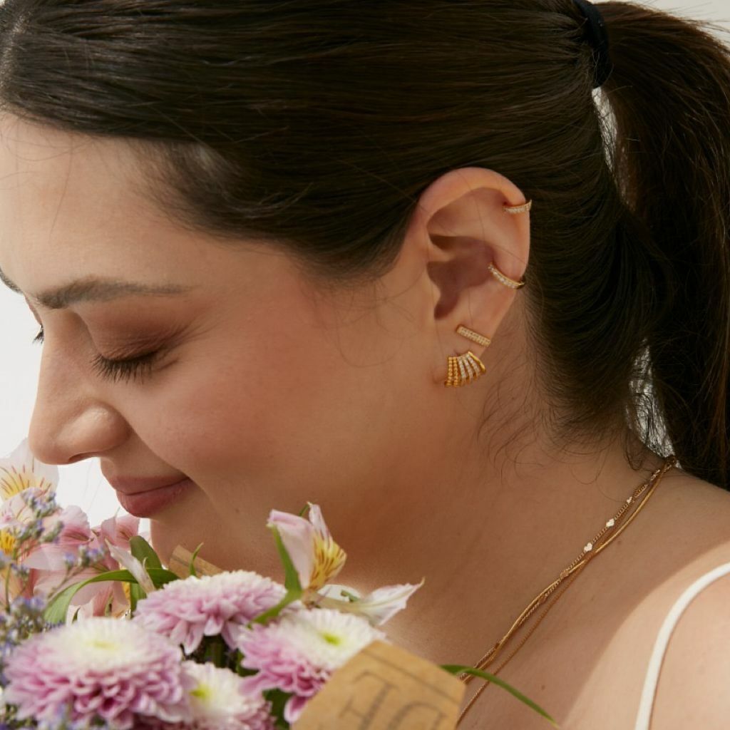 Brinco pequeno modelo palito com zircônias e banho de ouro 18k. Delicado e minimalista.