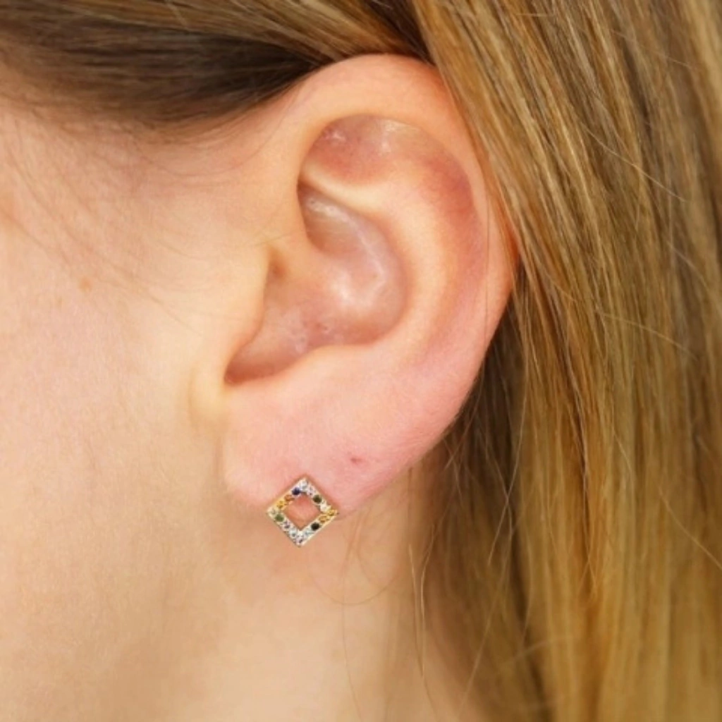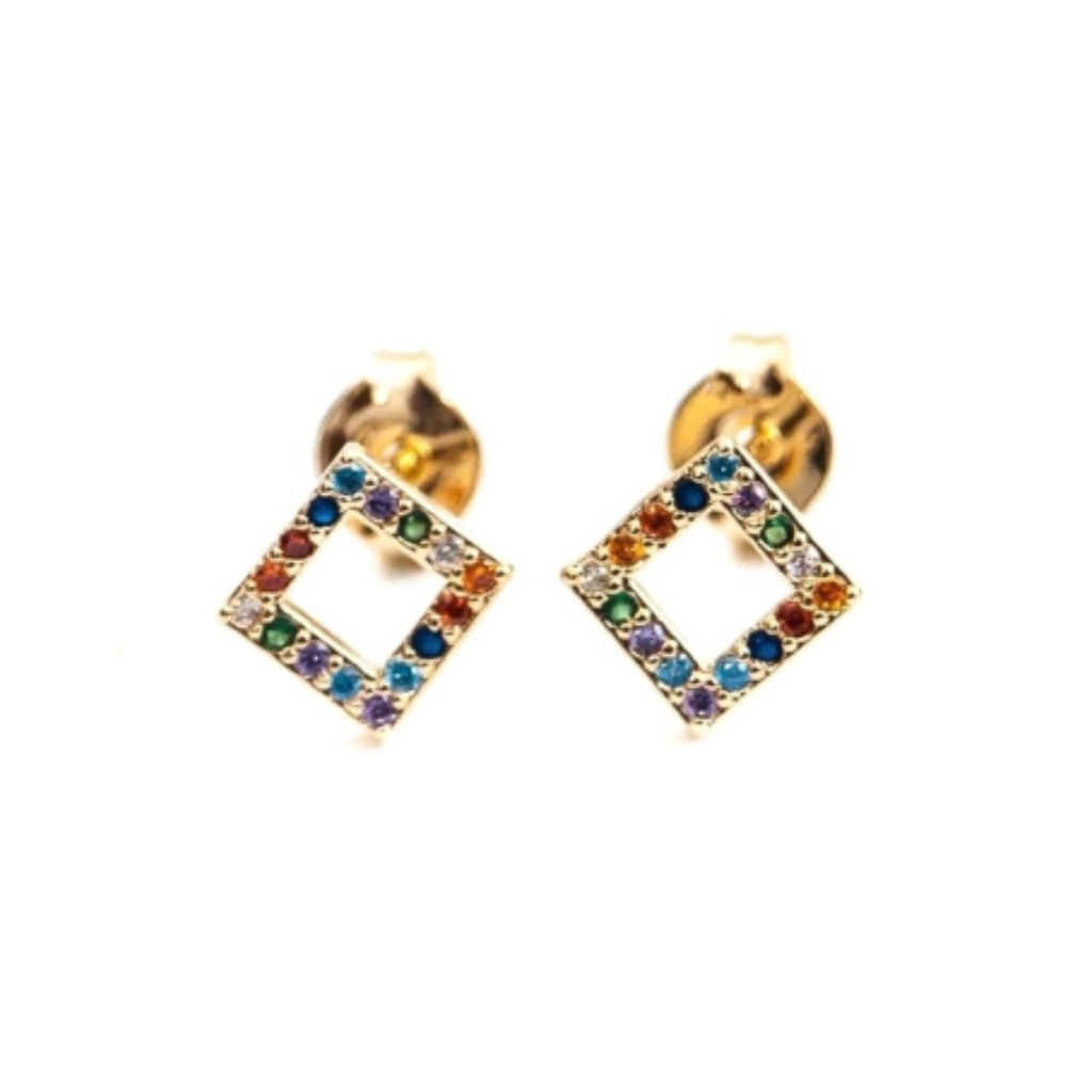 Brinco miamaia modelo quadradinho com zircônias coloridas. É delicado e dá um charme para a composição.