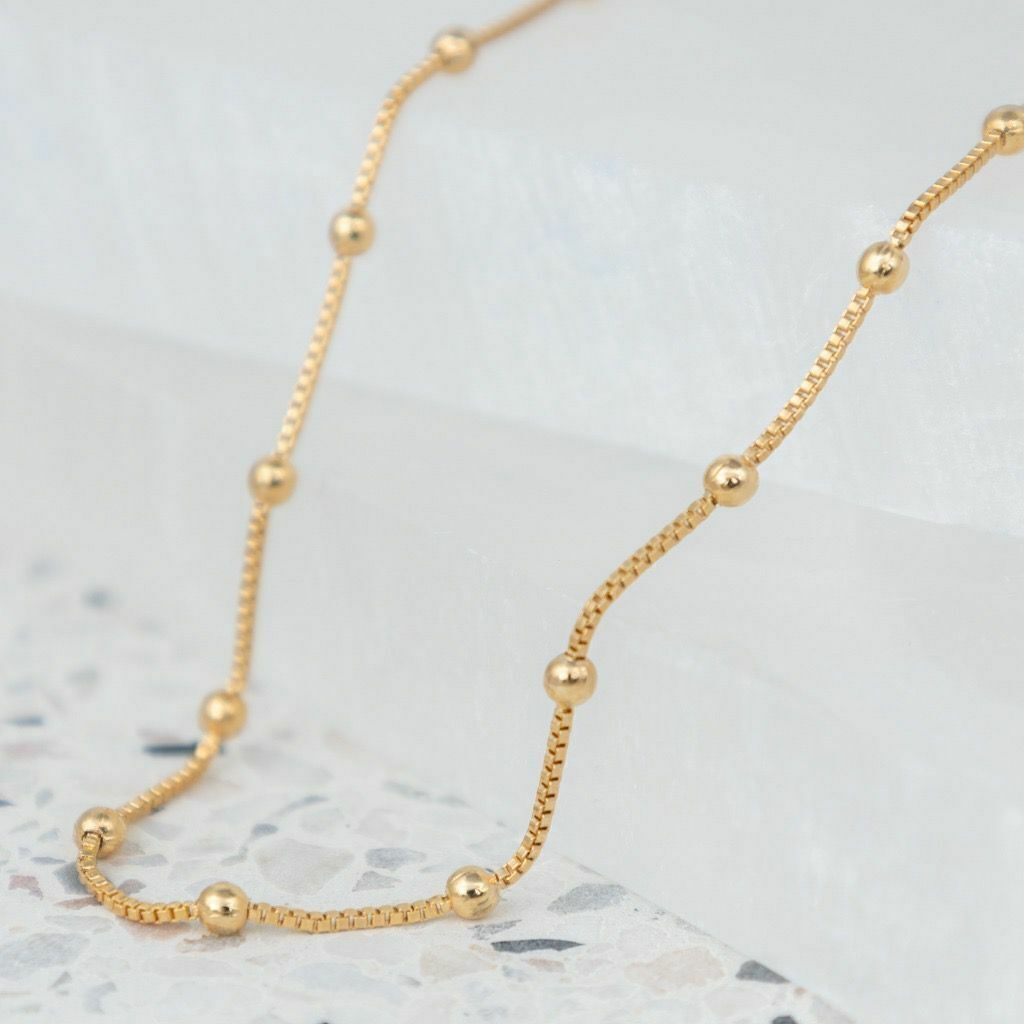 Colar modelo gargantilha com bolinhas e banho em ouro amarelo 18k. É uma peça minimalista e delicada.